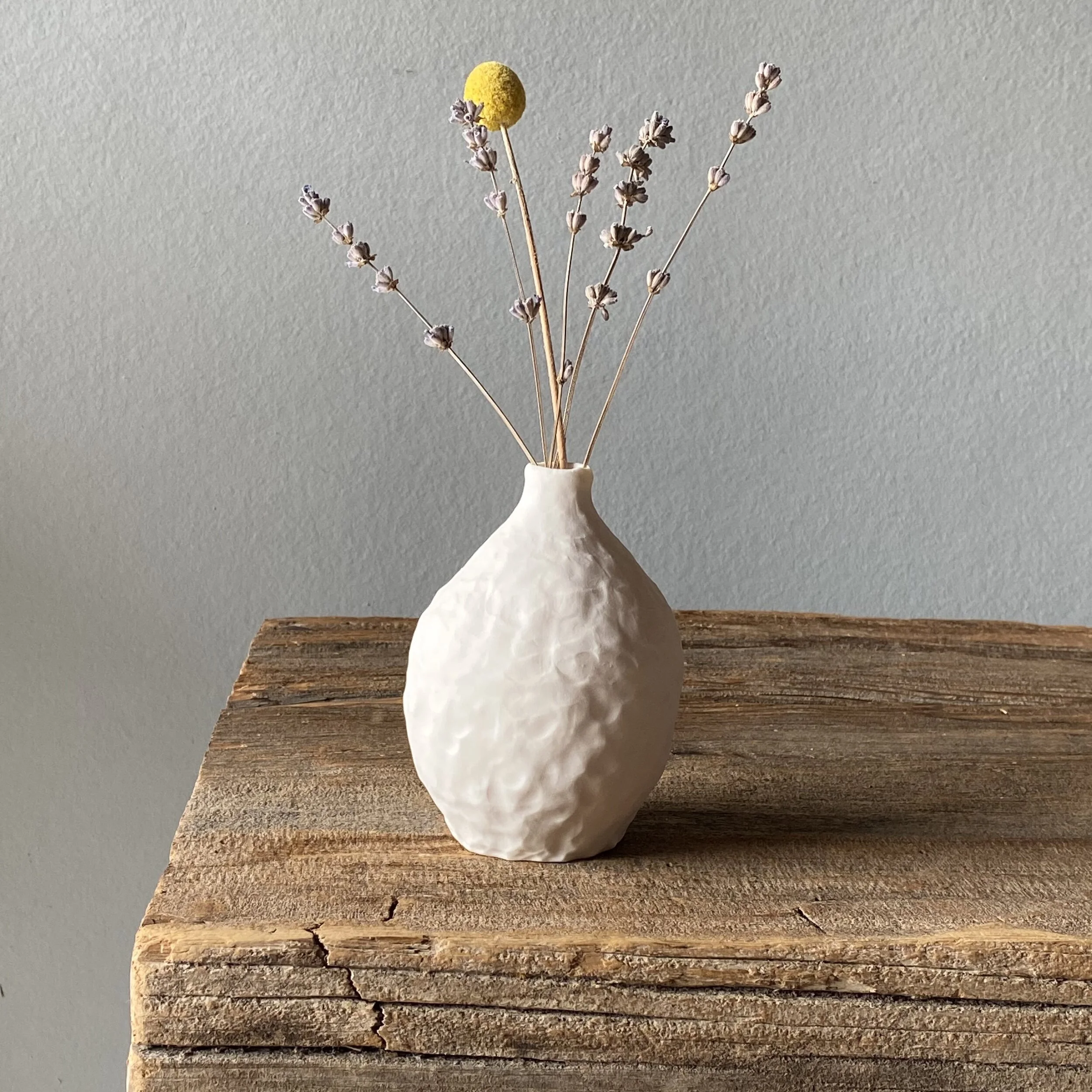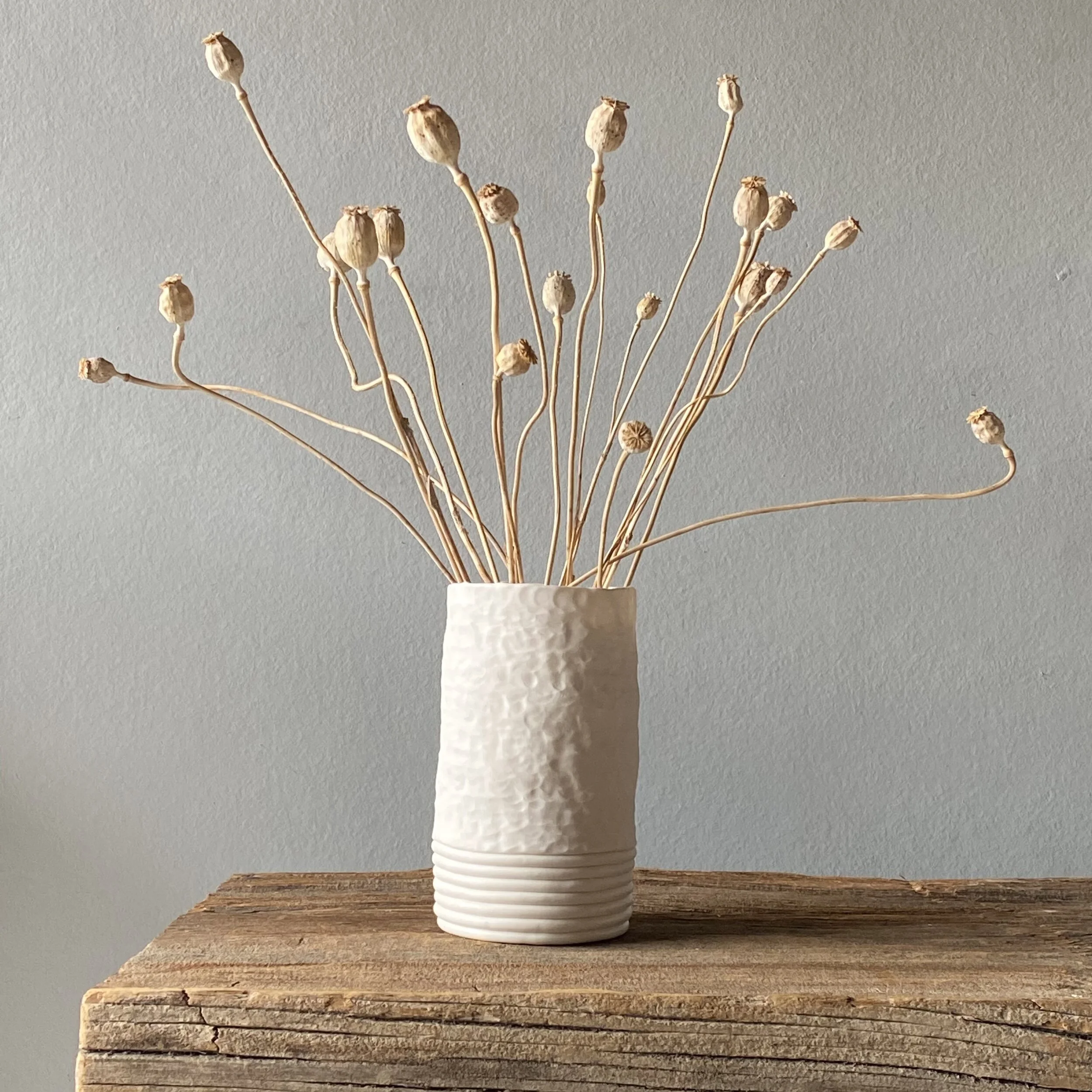 This large vase was hand built using the coil and pinch technique. The porcelain clay is raw and unglazed on the exterior of the vase to showcase the beauty of the clay itself, allowing the coil seams and fingerprints to be the surface decoration.